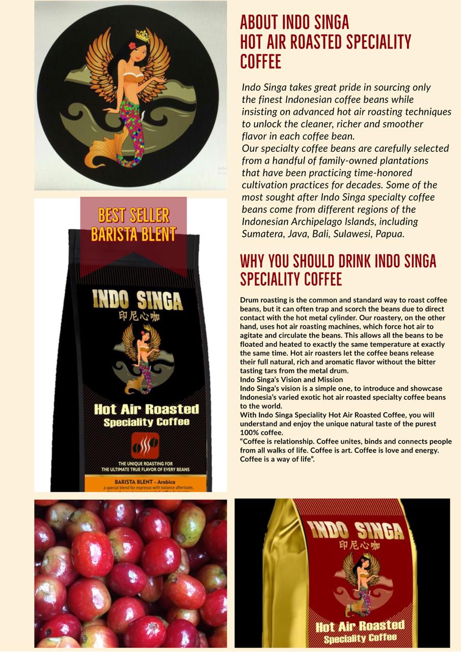 Hot Air Roasted CoffeeINDO SINGA HOT AIR ROASTED COFFEE provides Speciality Coffee and Premium Coffee, with a hot air roasting method, is using such forced hot air to agitate and circulate perfectly the raw coffee beans inside the roasting chamber, and roast the raw coffee beans evenly in the same time to reach the ultimate true flavour of every bean.